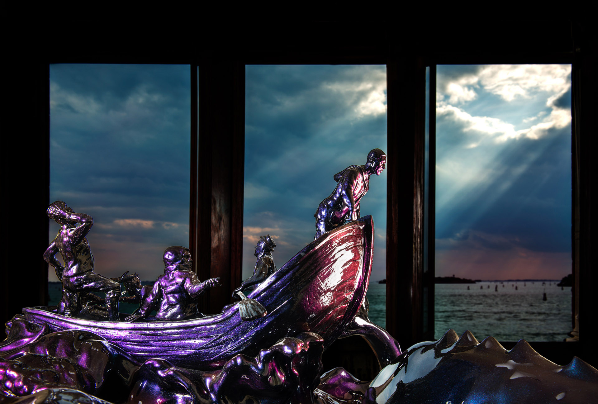 In this exhibition, the hanging paintings referred to the present, the sculptures to the past, and each film imagined a world 20–50 years into the future. Yet there was a dynamic interplay between these works and the materials they employed. The paintings were created on Fortuny textiles popularised in the 1920s; the sculptures referenced Jonathan Swift and Moby Dick but were produced using 3D printing technology; and the films combined shot footage, archival material, and analogue techniques to contemplate the future.